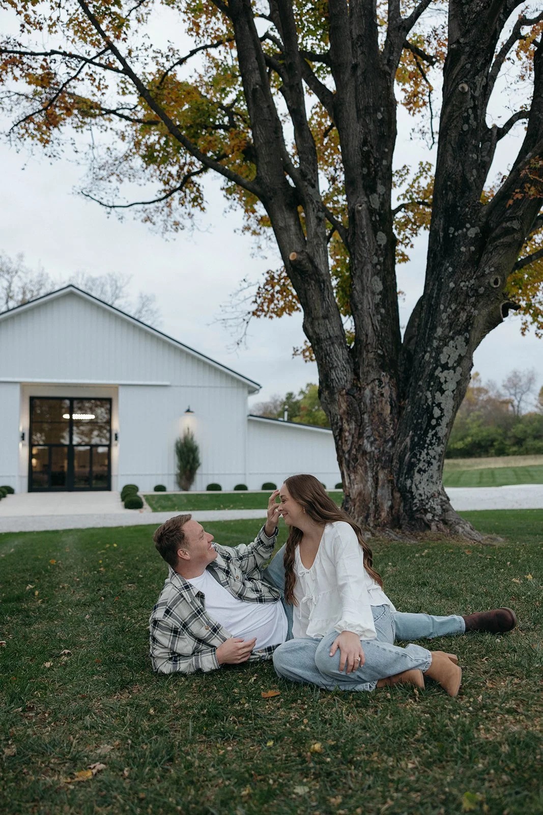 After that I had them just run around and play in front of the venue. No posing, no direction. Just move. And they did. Spinning, pulling each other, showing off the ring, sitting in the grass under that massive tree with the barn glowing behind them. That’s when I get the shots that matter. When they forget the camera is there.