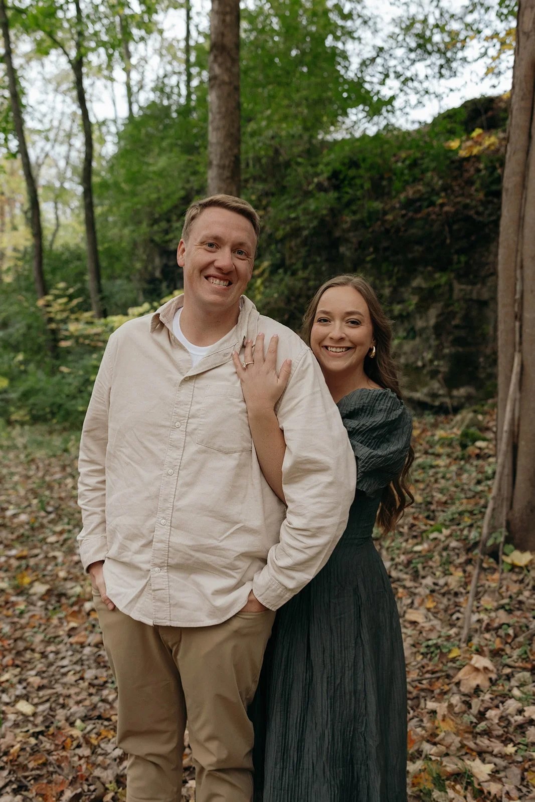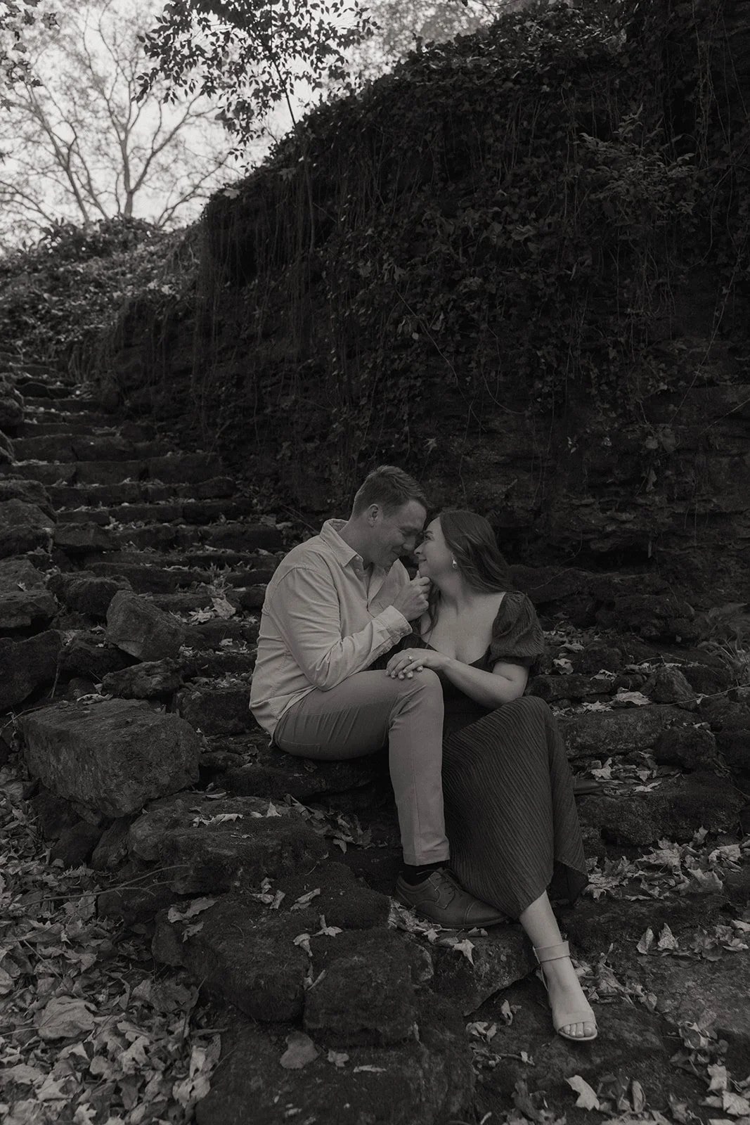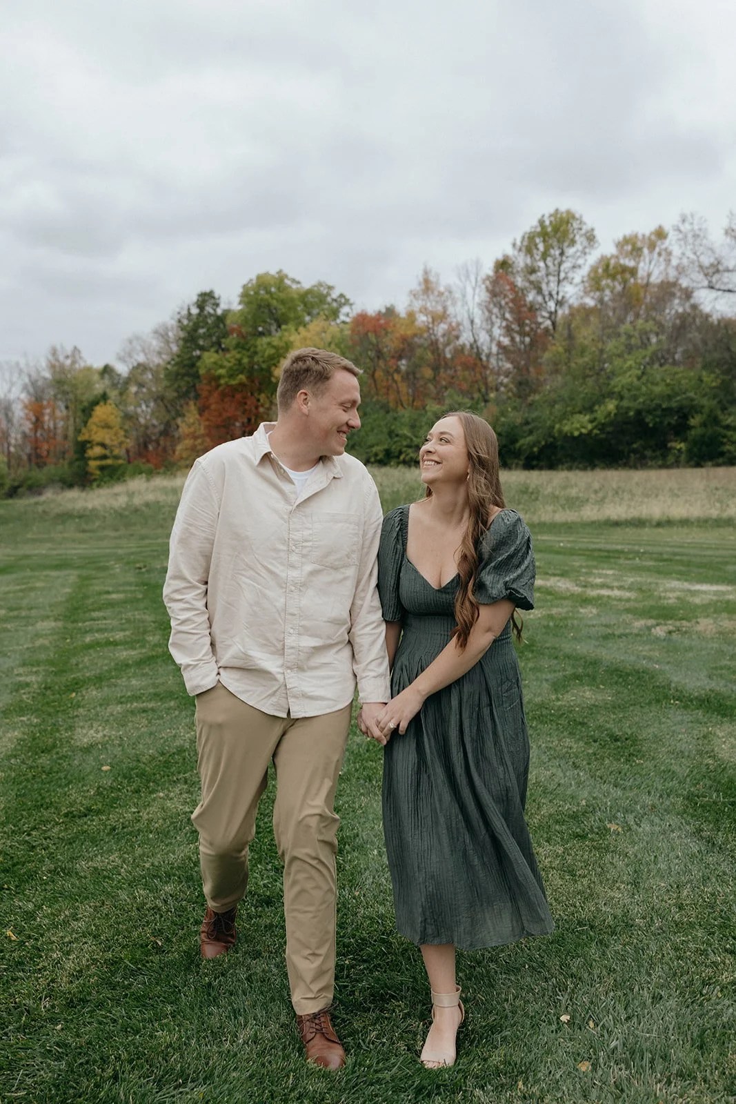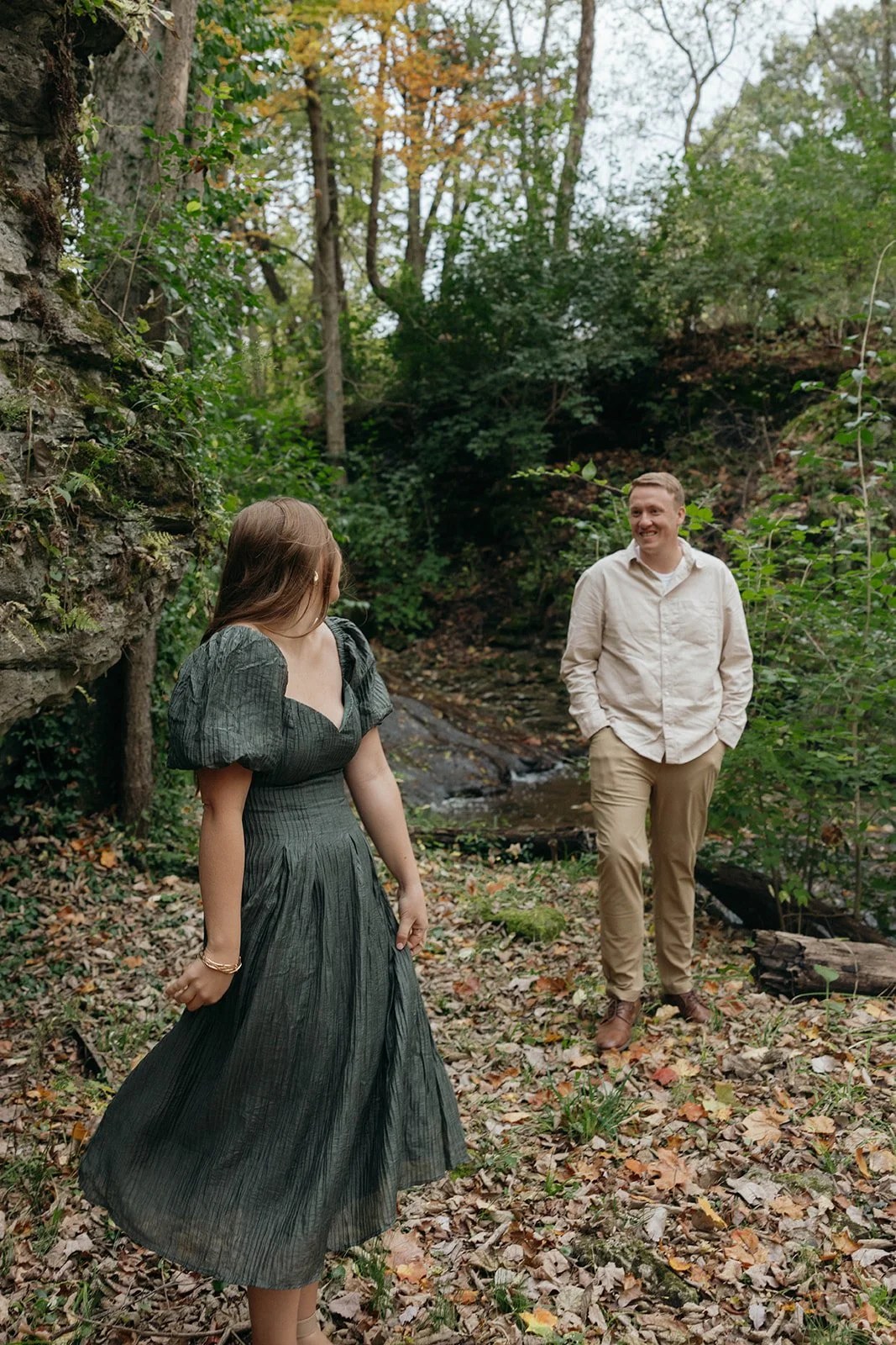 They came with two outfit changes, which I always love. We started with something a little more dressed up. A flowy dark dress for her, a linen shirt for him and used that look for the more moody, wooded parts of the property. Black and white felt right there. The light filtering through the trees, fallen leaves everywhere, him smiling at her from across a clearing. Quiet and still.